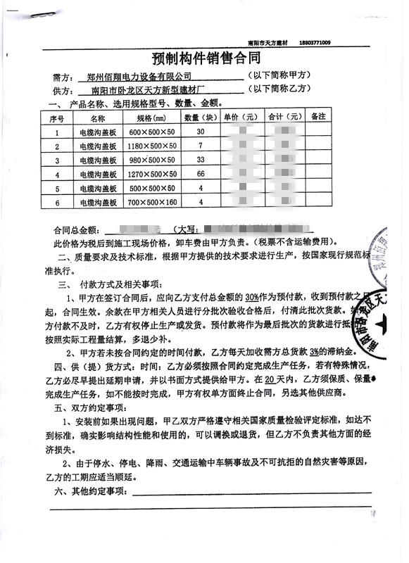 熱烈祝賀貴公司與鄭州佰翔電力設(shè)備有限公司就預(yù)制電纜溝蓋板項(xiàng)目成功簽訂合同。